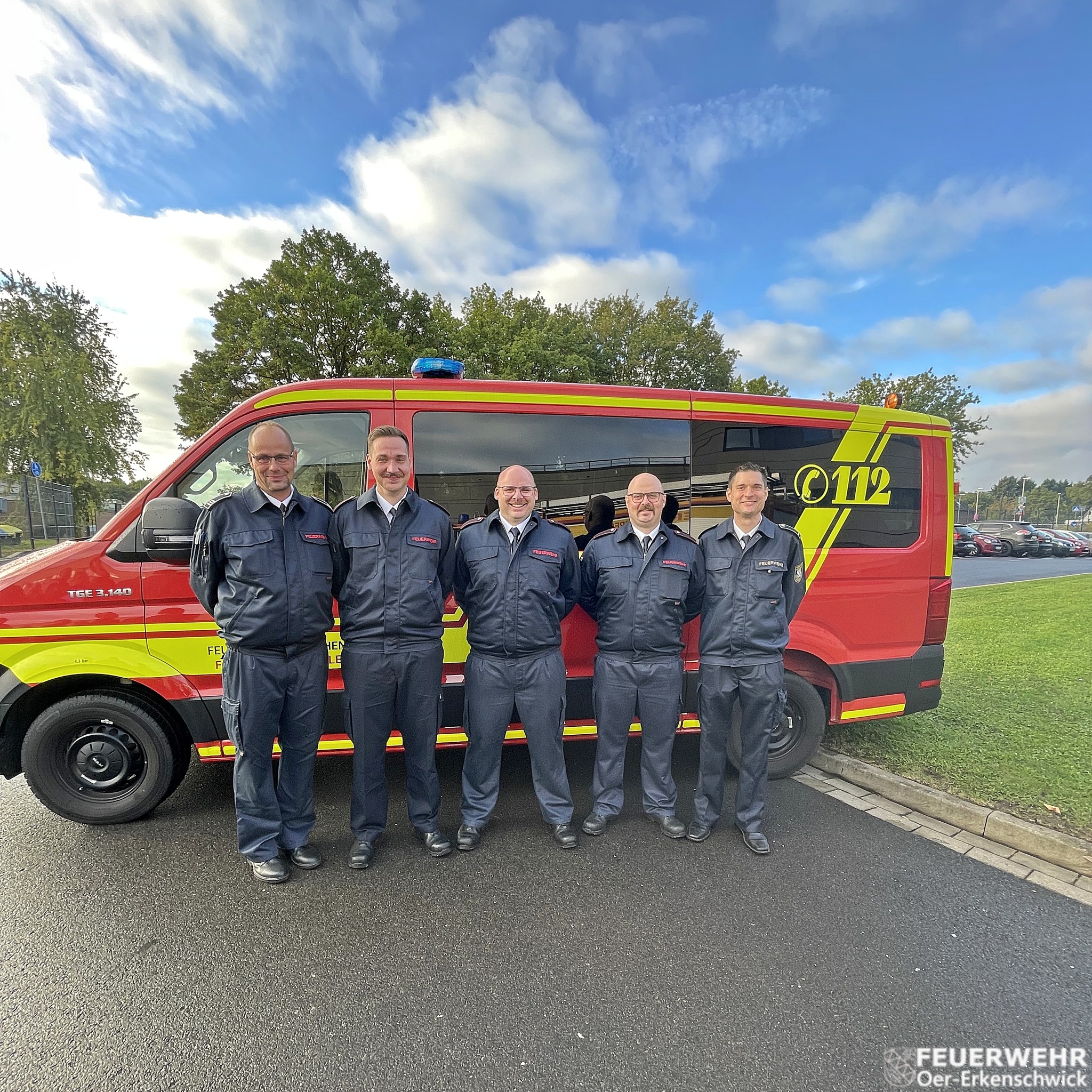 Die Feuerwehr Oer-Erkenschwick freut sich über die Verstärkung durch drei neue Brandmeister. Nach einer 18-monatigen Ausbildung in Theorie und Praxis haben Lucas Jetten (2. von links), Christian Klein (3. von links) und Georg Kersting (4. von links) ihre Laufbahnprüfung erfolgreich abgeschlossen.